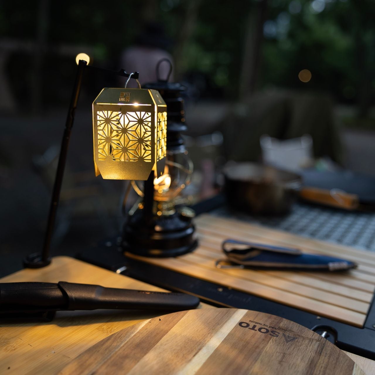 精密なレーザー切断で描かれた麻の葉模様が、灯りの中でやわらかに揺らめきます。
