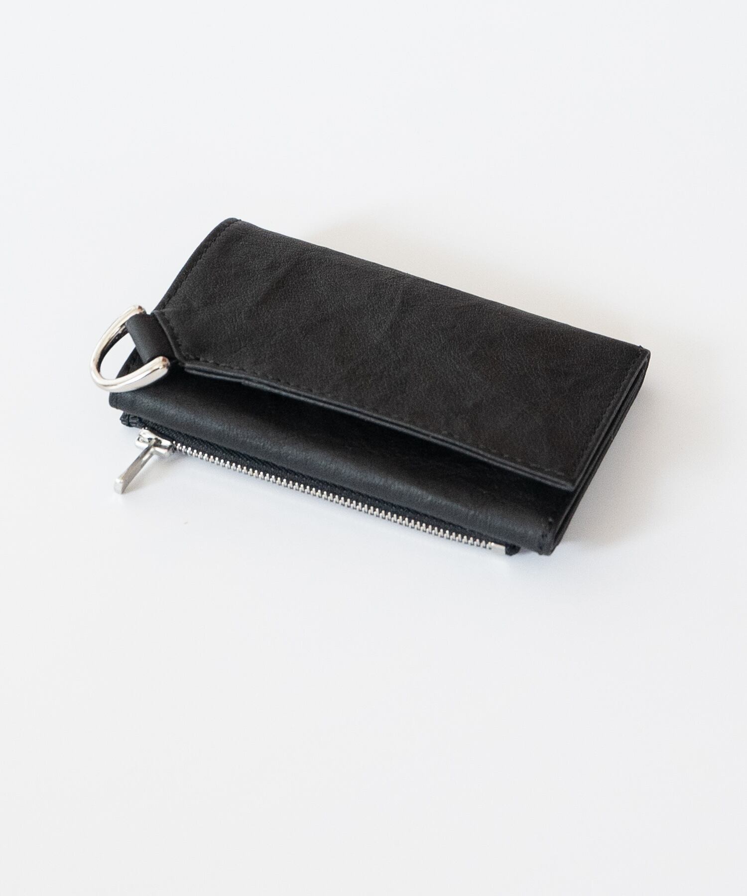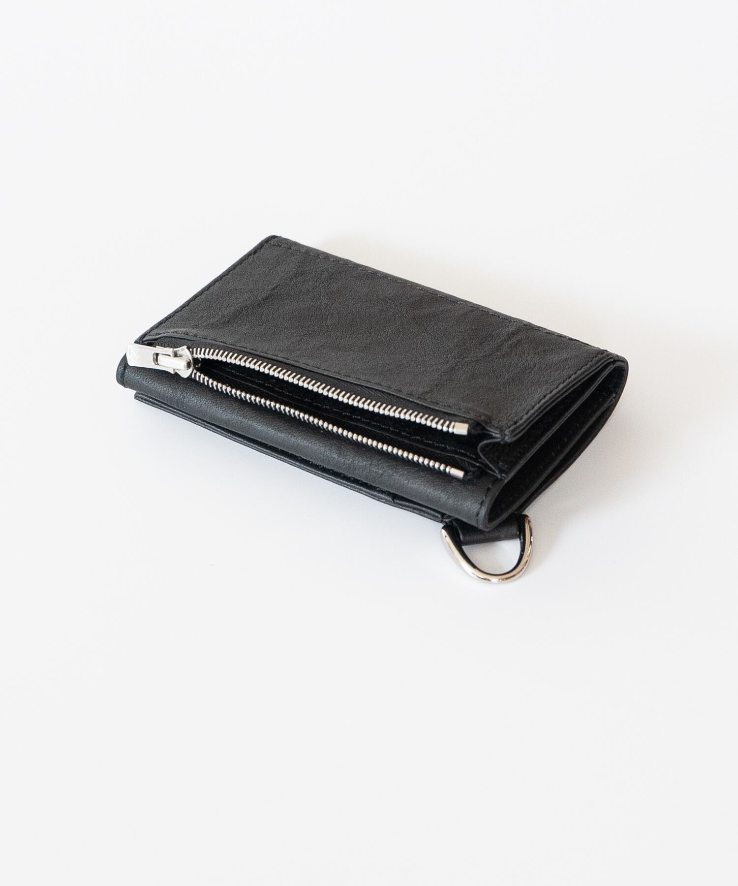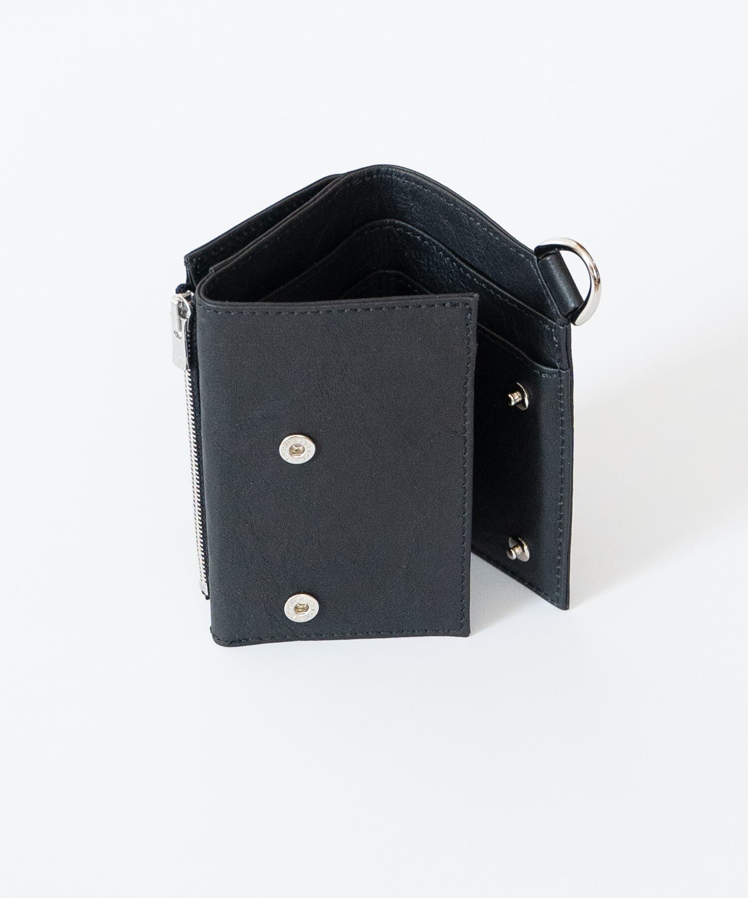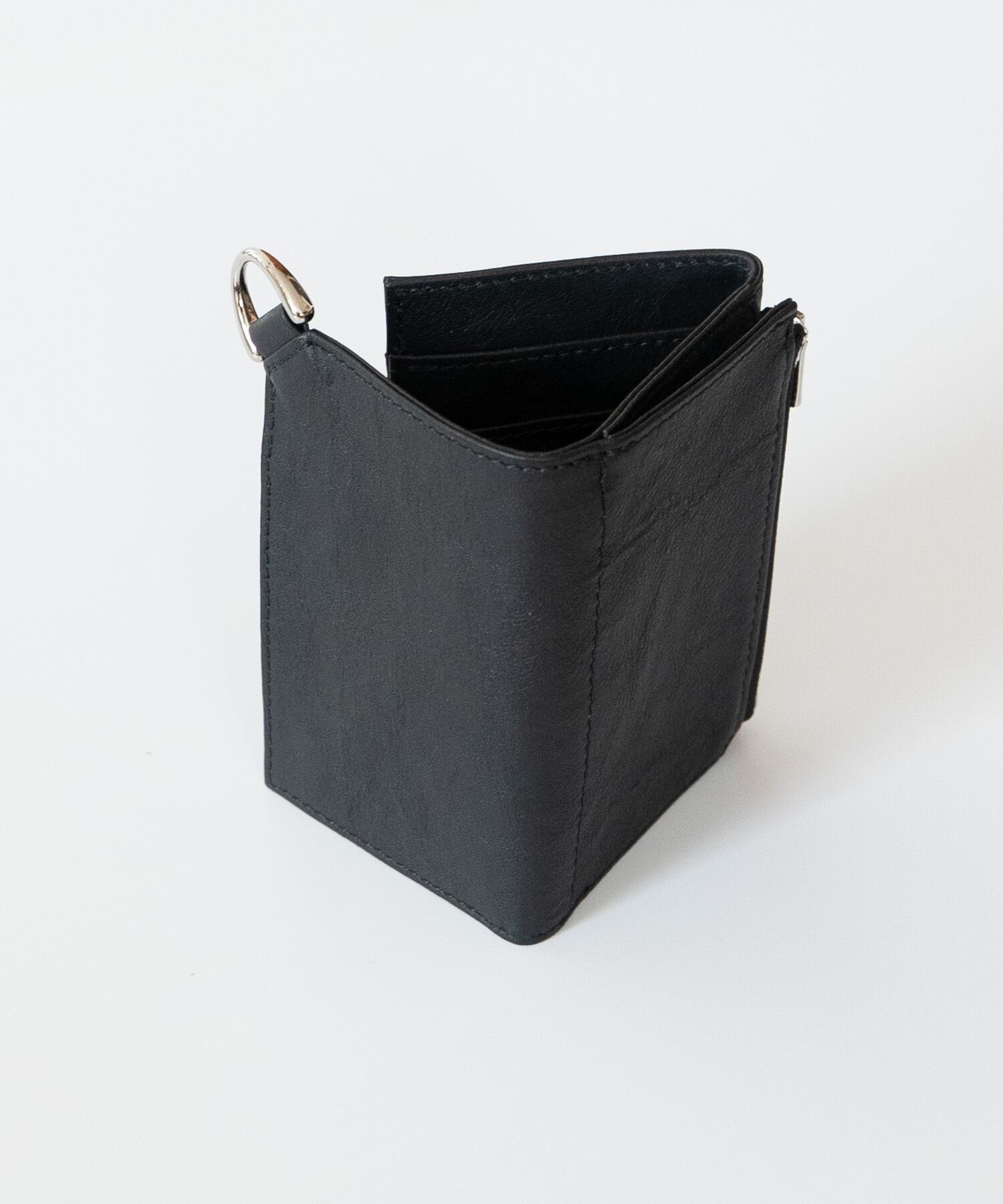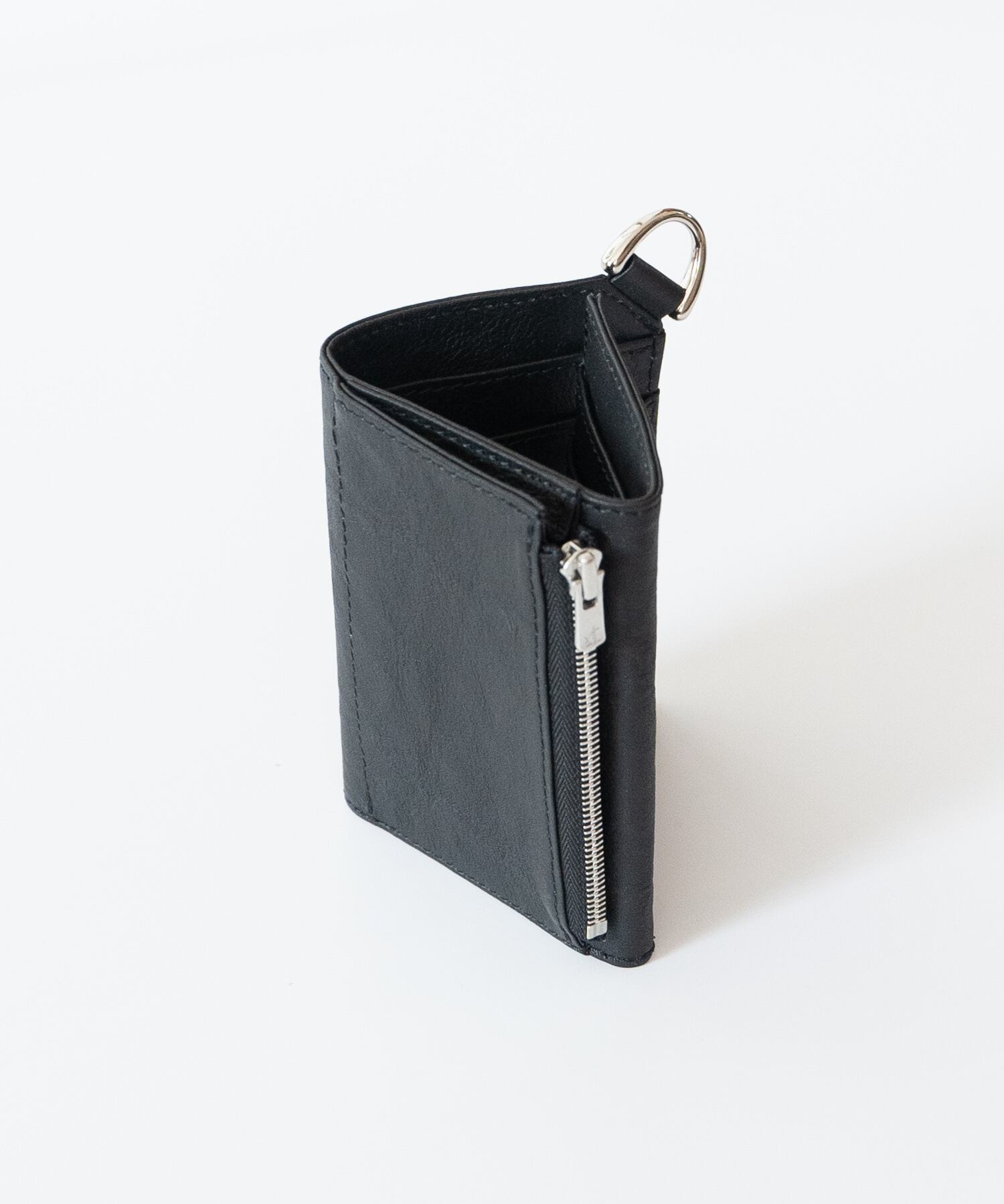 内側にカードポケット、札入れ、折りたたんだ外側にはコイン用のジップポケットを配しています。