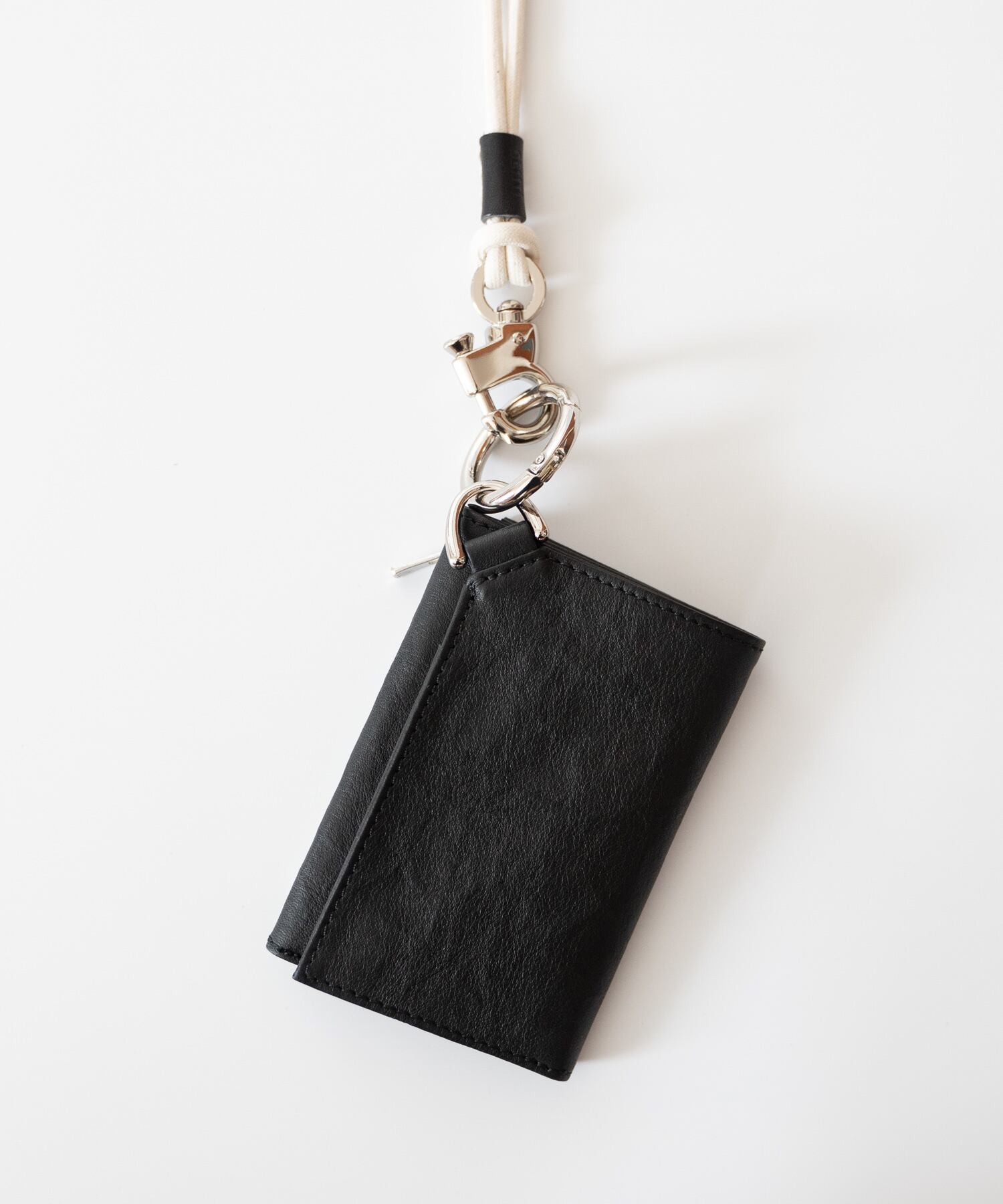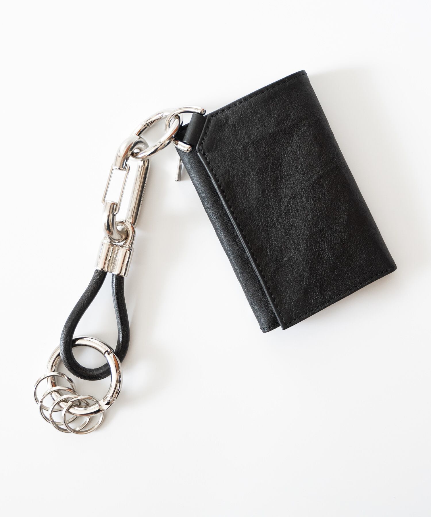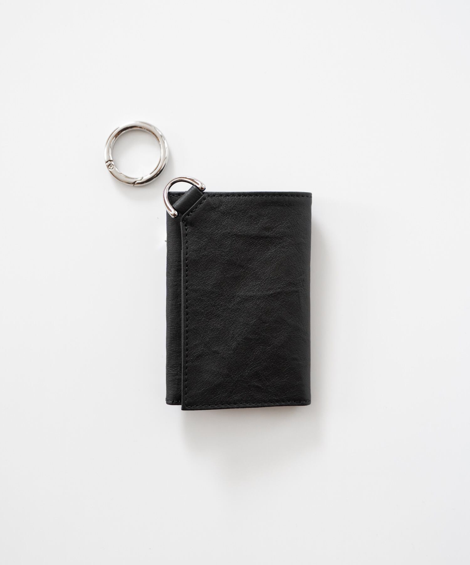 仕様:3つ折り構造/カードスリット×複数、札入れ、外側ジップコインポケット、カラビナ付き